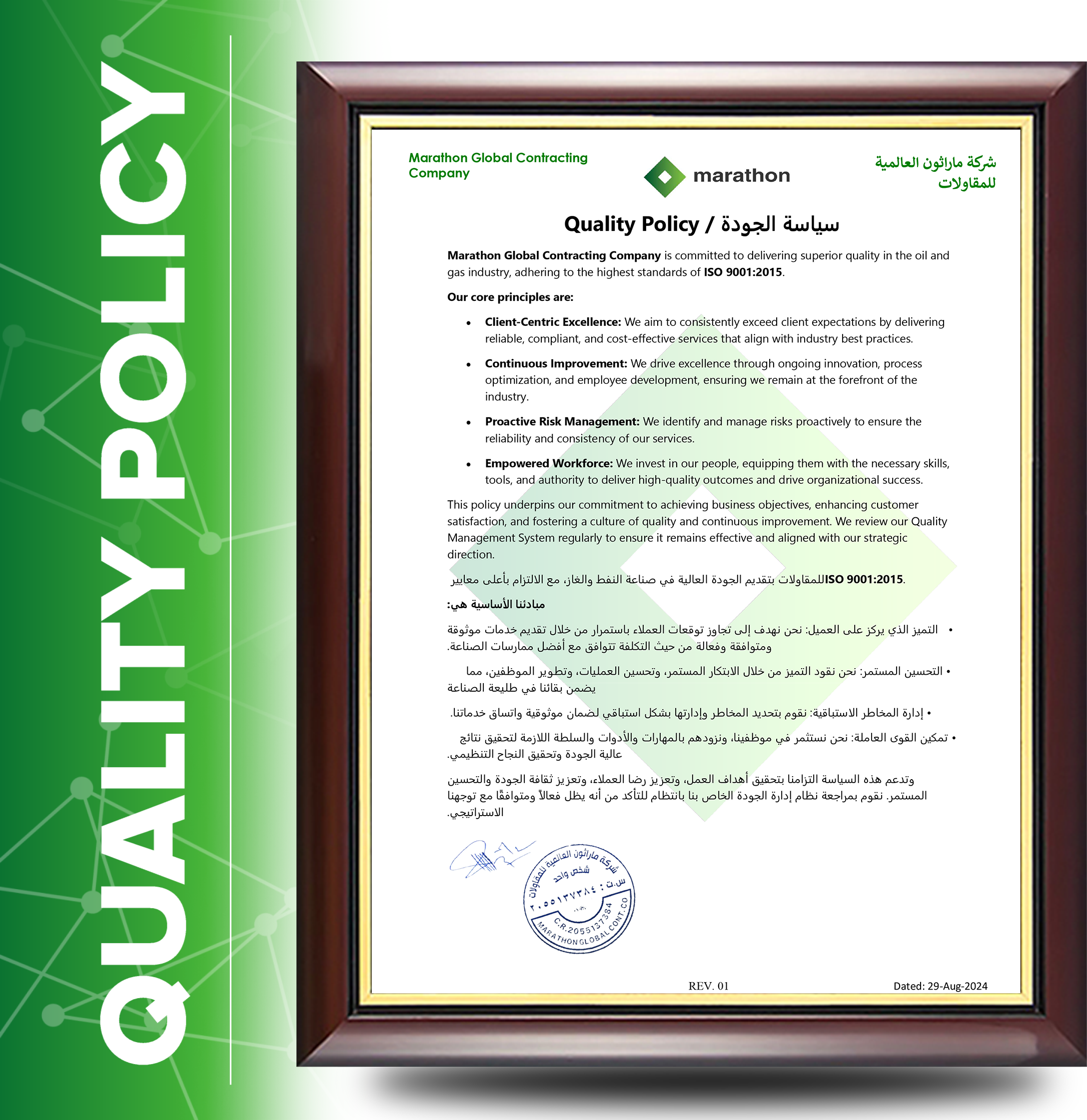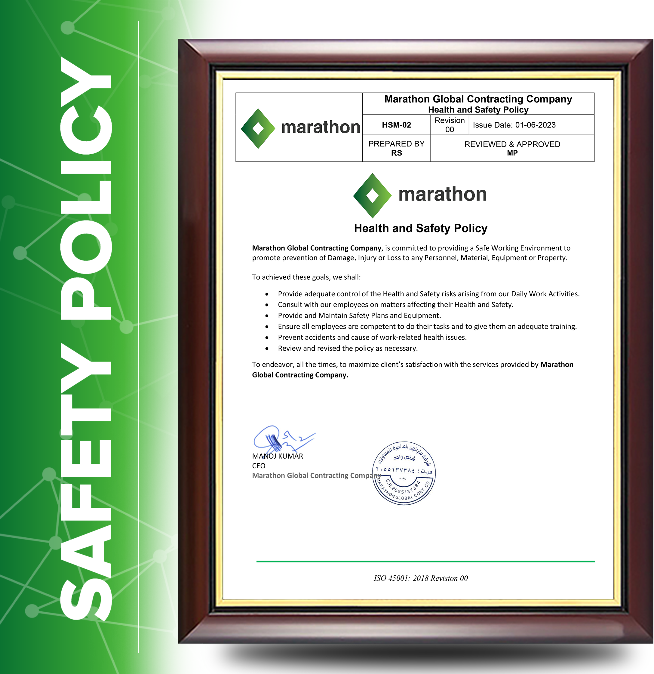 Marathon Global upholds the highest standards in safety, quality, and environmental responsibility. Our policies ensure compliance, efficiency, and excellence in every project we execute.
